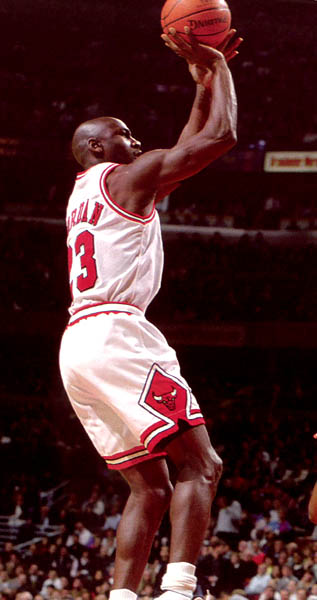。。而在这之后,乔丹进入了他投篮的第二个投篮成熟时期。这个时期,乔丹改变了之前的纯侧身投篮方式,后仰跳投继续沿用,而原地跳投都改成略微侧身30°-45°左右的类似正面投篮动作了,发力原理还是原来的右手肩上出手的技巧。在这个时期,乔丹的动作在细节上有了很强的完善,等于是飞跃,一个是,乔丹的左臂不干扰球技术练到了炉火纯青的地步,如果说第一个时期,是左臂扶在侧面来不干扰球,所以出手后左臂弯曲较厉害;第二个时期乔丹纯侧身投篮,右手肩上投篮,出手后左臂是直的,依靠右手在右肩上出手和左手的侧面扶球来达到不干扰投篮;而第三个时期就等于是综合了之前的经验,略侧身但是左手扶球位置更合理,依靠了左手的扶球技巧以及左肩回拉和右臂的独立的主动直臂出手技术,来达到投篮的稳定。第二个就是,乔丹在这个时期,举球的细节发生了巨大的变化,其实乔丹原本的举球技术就很出色,不过在这个时期,乔丹把他的举球技巧提升了一个层次,就是我们日后讲到的永不挺腰的举球方法。这一点我们不得不佩服乔丹的细心,在这一点上,乔丹把他的投篮技术练到了一个化境,尽管说目前科比请来了乔丹的私人教练,但是很显然的,乔丹的教练恐怕懂的也不如乔丹这么多。因为起始的高度就不同,即使是教练,没有经历过乔丹的这些技术历程,是不可能凭空的去开发出这样一套合理的动作的,所以,有些东西,最后只有自己才能摸索到门路。