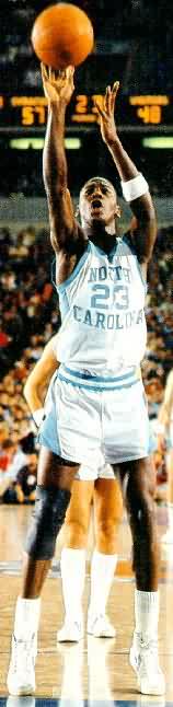 。。这个图片是乔丹大学时期那次最后成名的绝杀球,可以很清楚的看到,乔丹举球以后,在肘部和肩部平齐的瞬间(这里我们可以顺便注意到,早期乔丹基础投篮动作的肘部比后期要低),在这个时候篮球在侧面看,挡住了一部分头部而并没有碰到头,也就是说,球在头部的一侧,如果是正面头中出手的话,在这个动作瞬间,球是无法举到这里的。所以,乔丹早期右手肩上出手没什么问题了。
