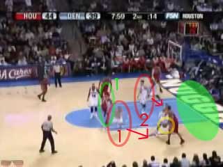 。。麦蒂迅速的超低身突破,一瞬间使用了2个技巧防止断球以及废除防守人的作用。第一个技术,是图上绿色箭头标识的让篮球远离自己的身体和防守人,右臂几乎伸直,甚至到了底线来躲避抢断,这个动作做出来,对手即使身高臂长,显然也已经够不到球了。可以看到(3)号防守人的手臂(红圈内)距离篮球很远,断球完全不可能的。而这个时候,(3)号防守人的重心向前压,试图阻止麦蒂的突破,麦蒂将计就计(此时注意麦蒂的脚腕和地面的夹角,45°左右),整个身体大量的向左倾斜,几乎是一碰就倒的动作,依住了对方不说,还给了对方一个冲撞的力,之后可以看到,防守人的上身有略微的后仰出现,这样,就没有起跳的可能了。让对方不能起跳,并且摸不到球,还让(1)号防守人的作用为零只能站在旁边看着,麦蒂的第一步迈出去以后,目的几乎全部达到。(此时注意(2)号中锋位置防守人已经开始蓄力,准备盖帽了,麦蒂已经看到)。此时火箭的(2)号人物可以接球,不过麦蒂已经决定自己打了。