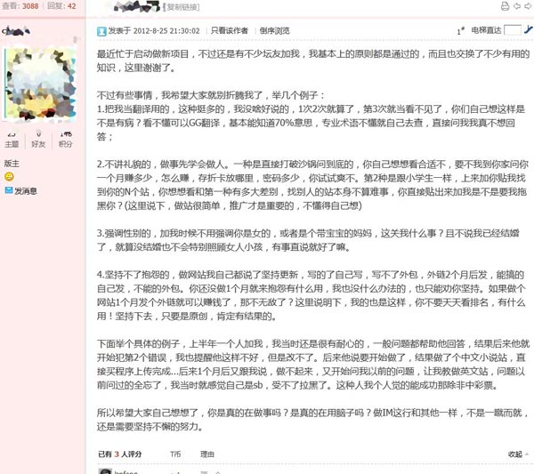 。。下面我给出一个触类旁通的例子来便于理解,这是一个网络论坛的高手发的帖子,我们算是同行。这个家伙呢月收入也早就到了6位数,至于是否七位数就算没有也差不许多吧。我们看看他写的一些话是否有和我们遇到的问题相同的。